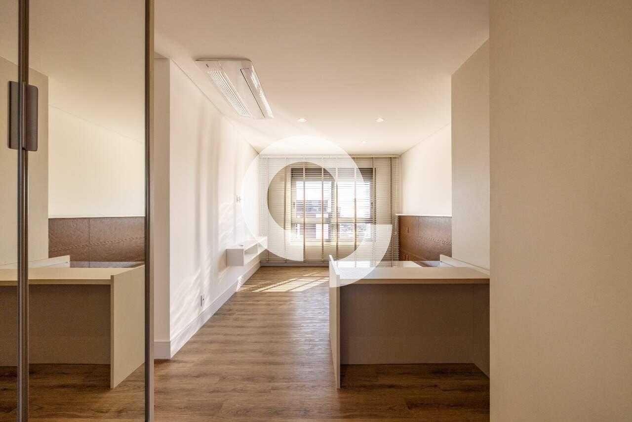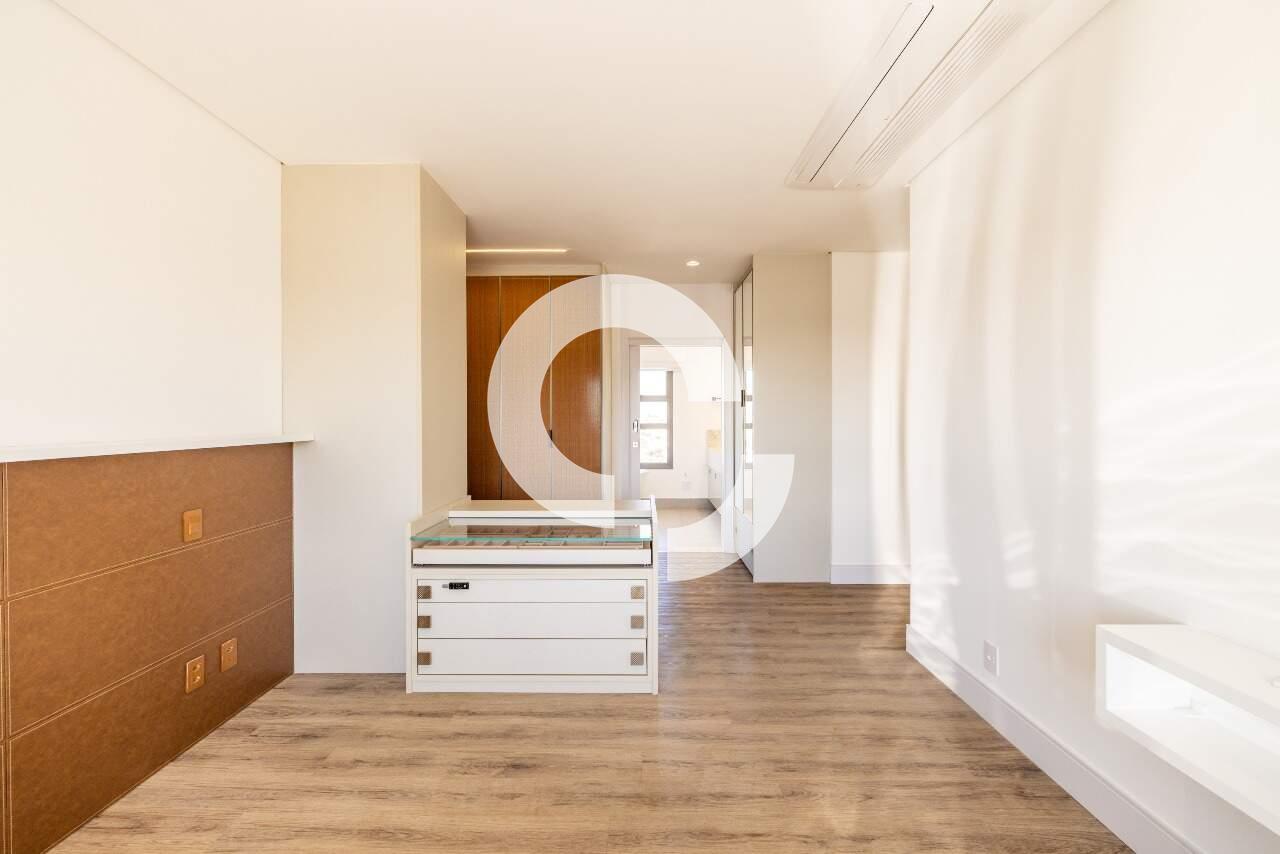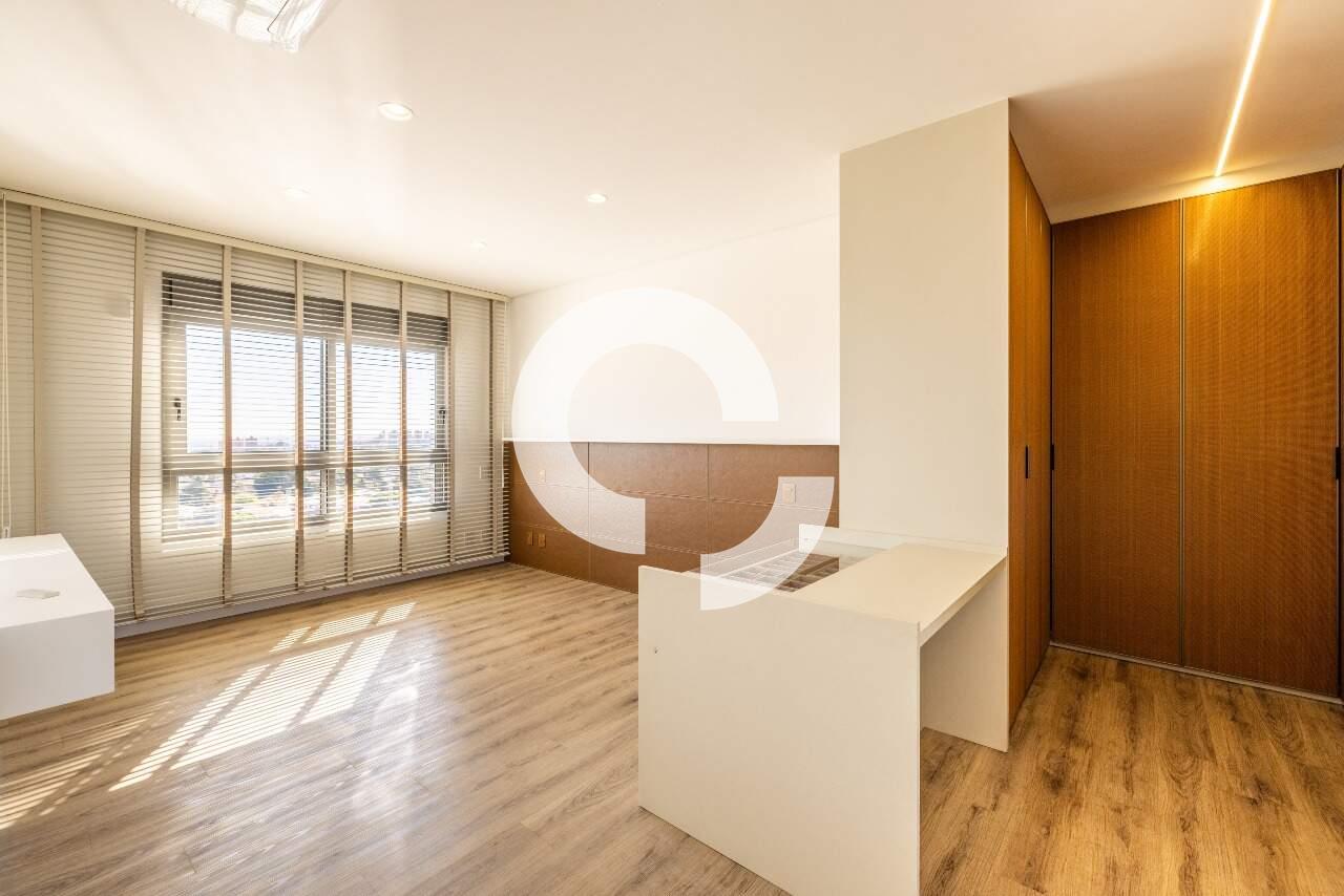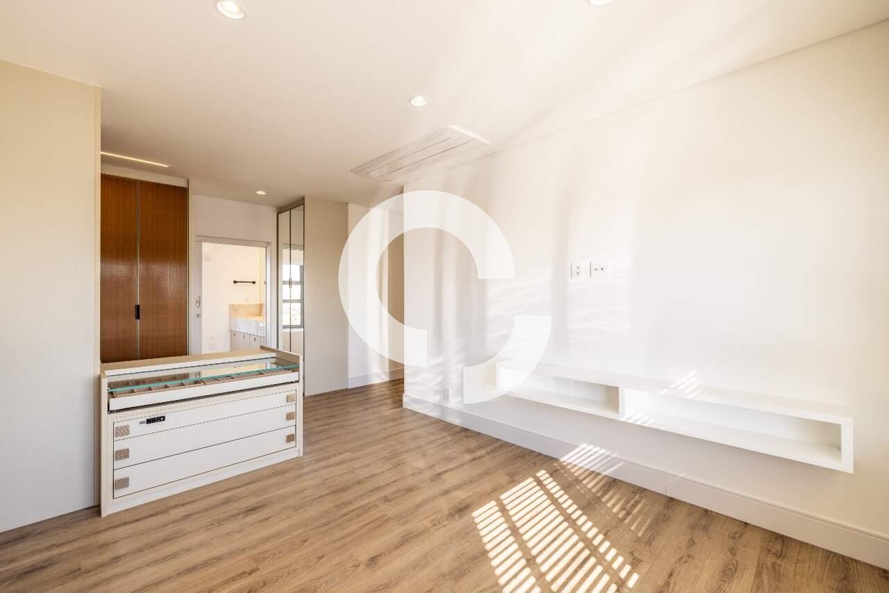 A planta ainda conta com despensa, área de serviço com entrada independente e banheiro de apoio. Quatro vagas de garagem completam a unidade, oferecendo praticidade e exclusividade.