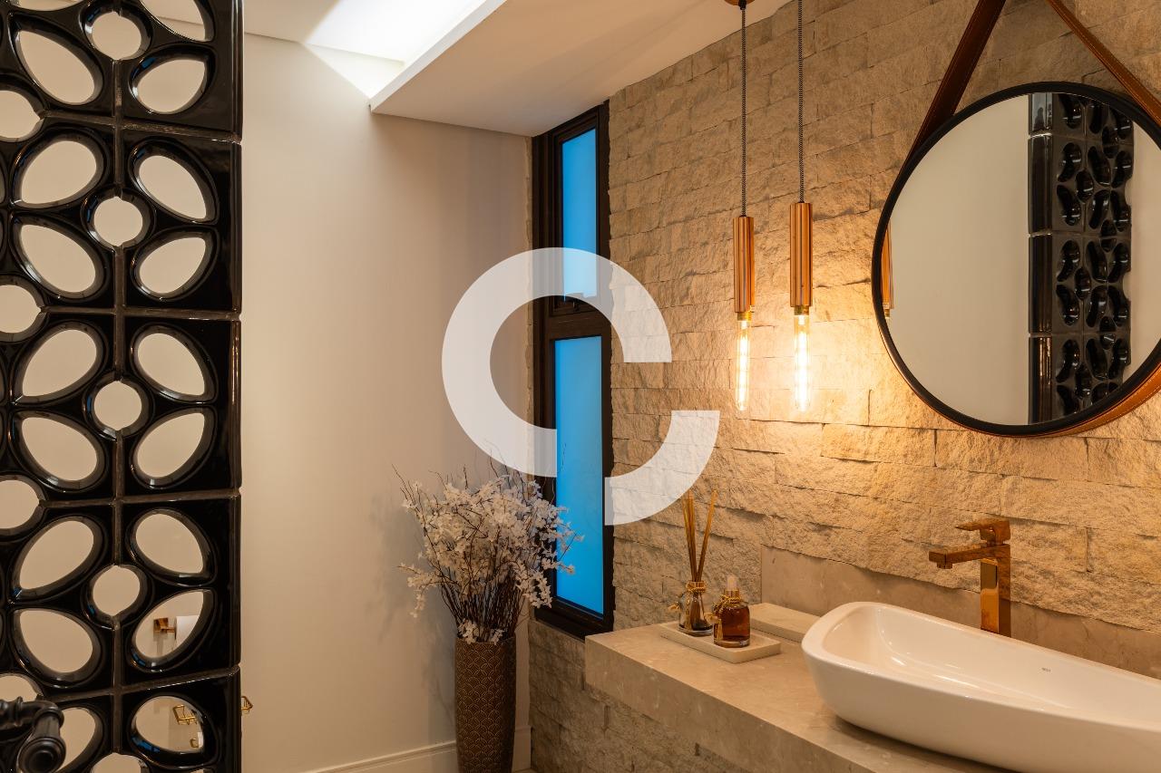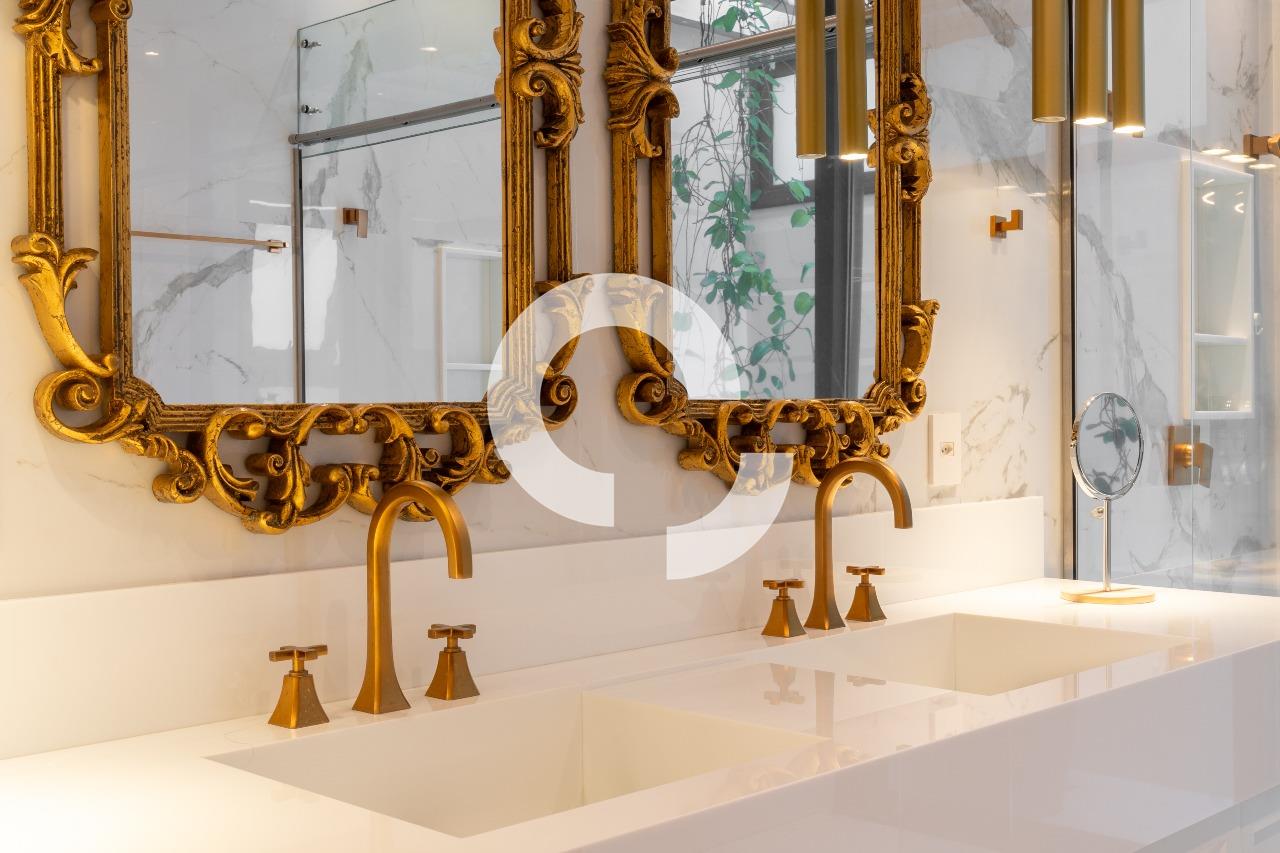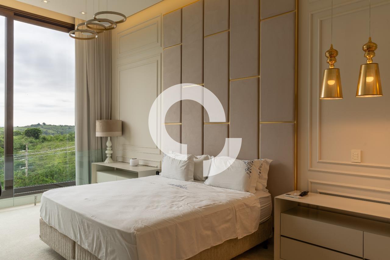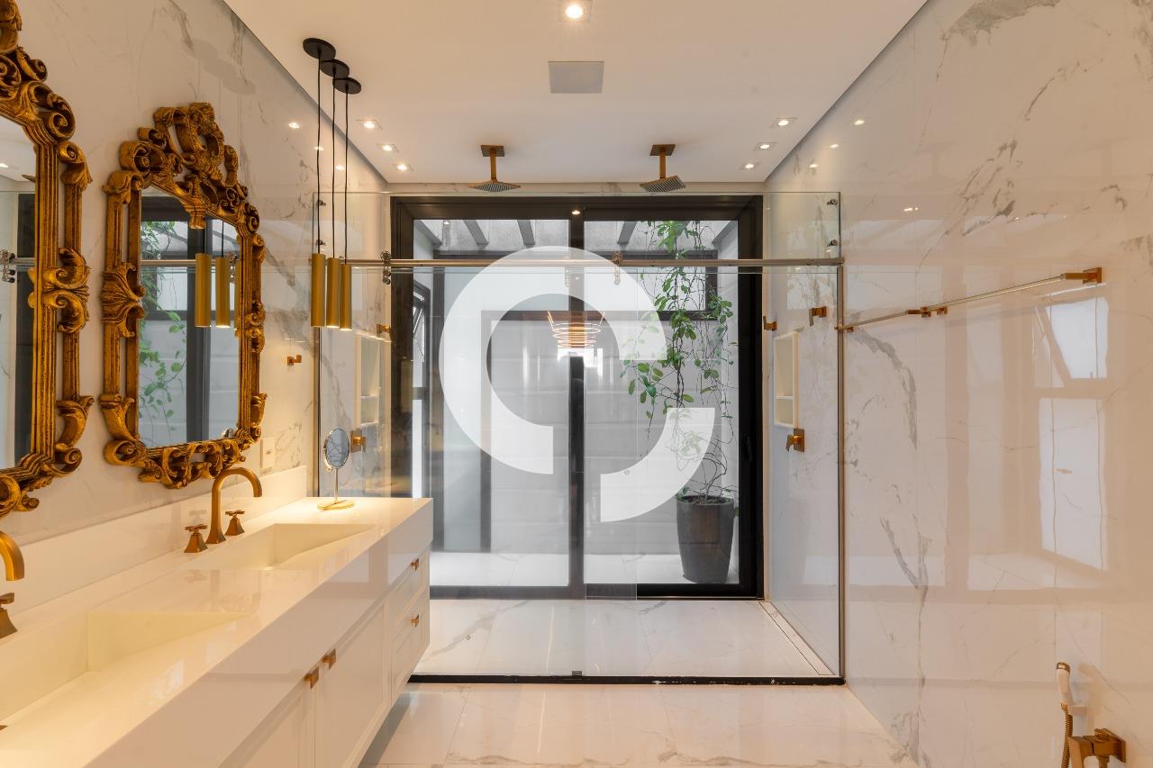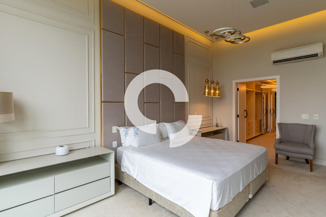 No pavimento superior, acessível tanto por escada quanto por elevador, estão cinco suítes amplas e confortáveis. A suíte master é um verdadeiro refúgio, com closet generoso e banheiro de design exclusivo, marcado por acabamentos refinados e decoração diferenciada.