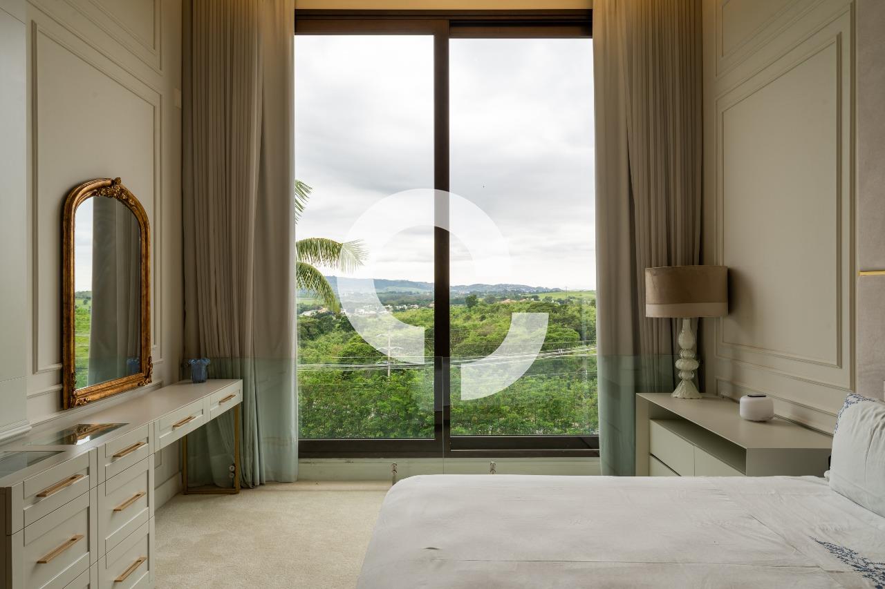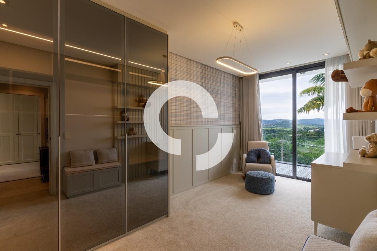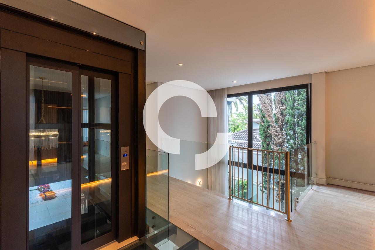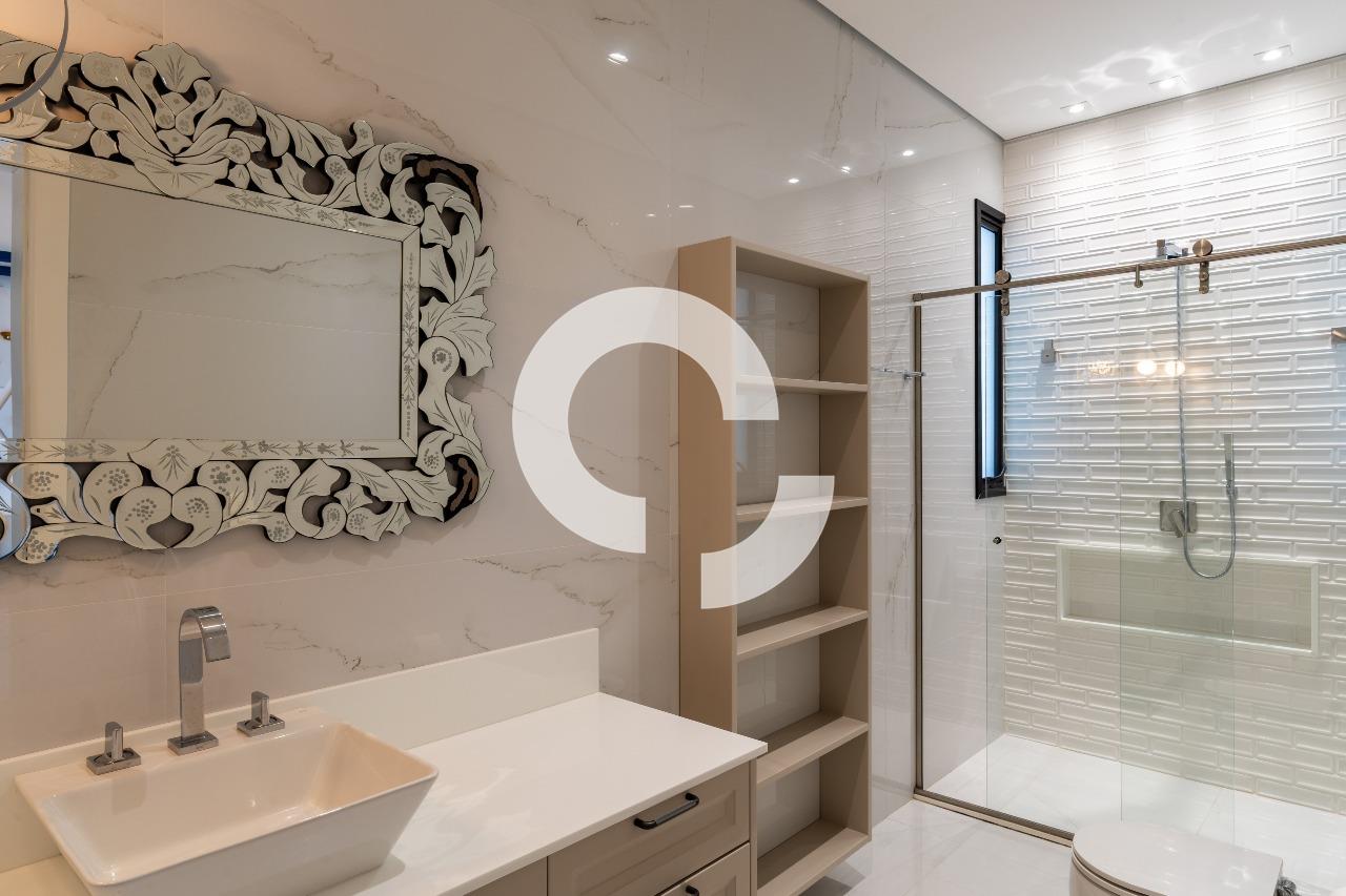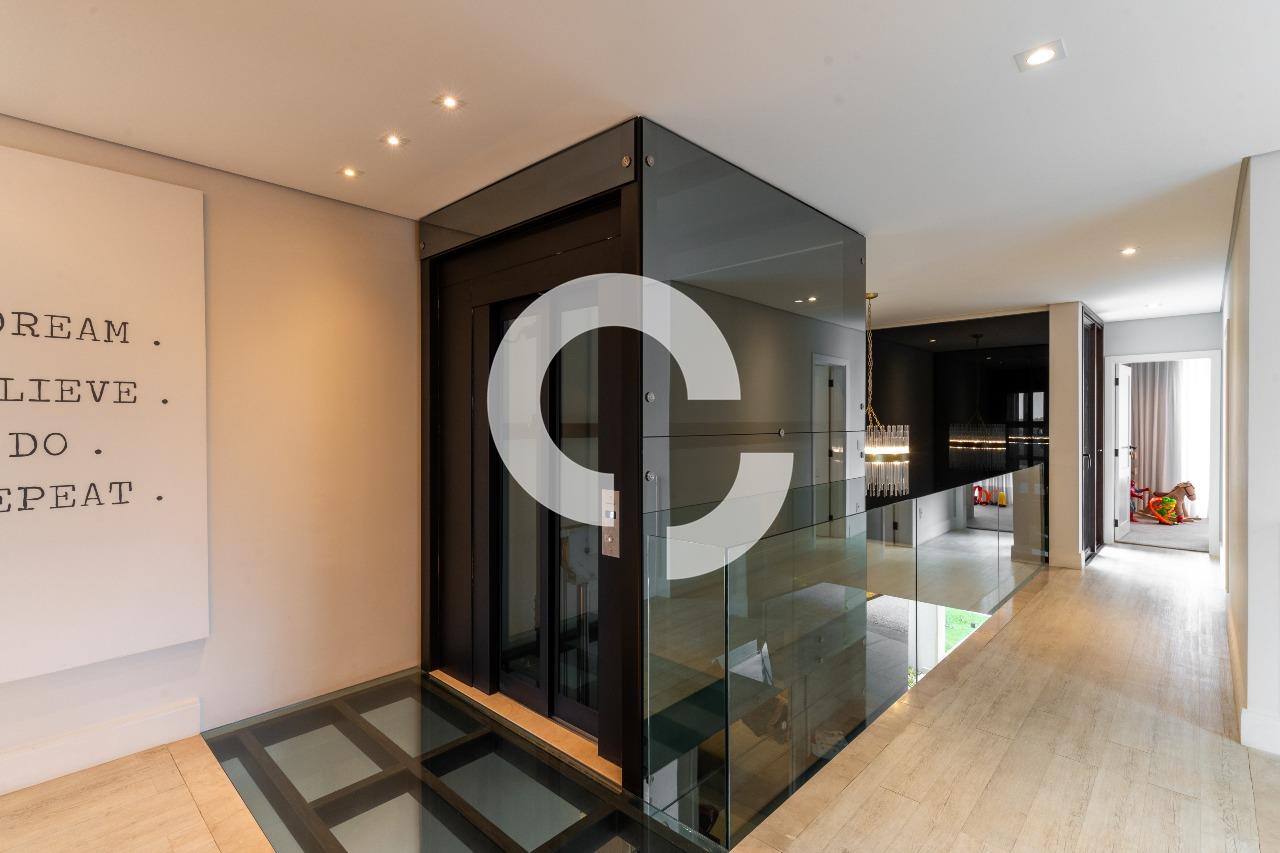 No pavimento superior, acessível tanto por escada quanto por elevador, estão cinco suítes amplas e confortáveis. A suíte master é um verdadeiro refúgio, com closet generoso e banheiro de design exclusivo, marcado por acabamentos refinados e decoração diferenciada.