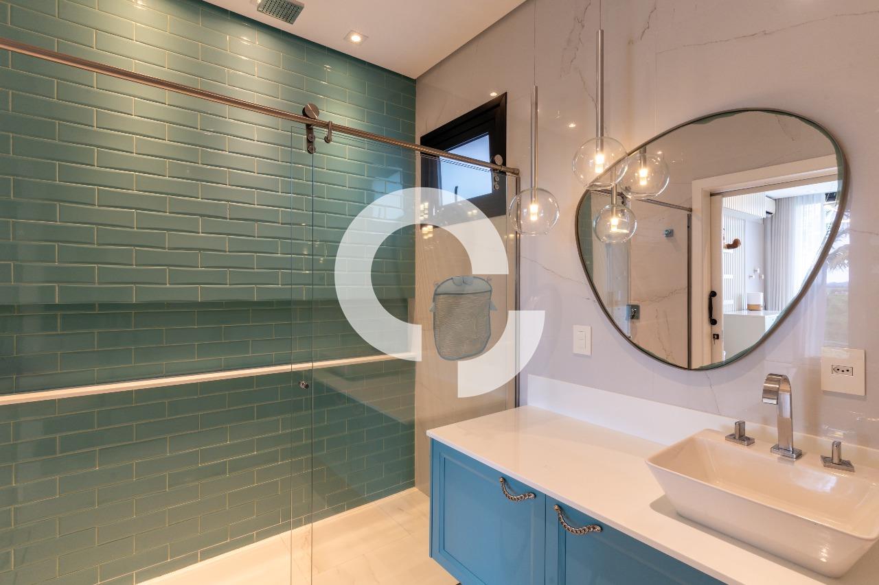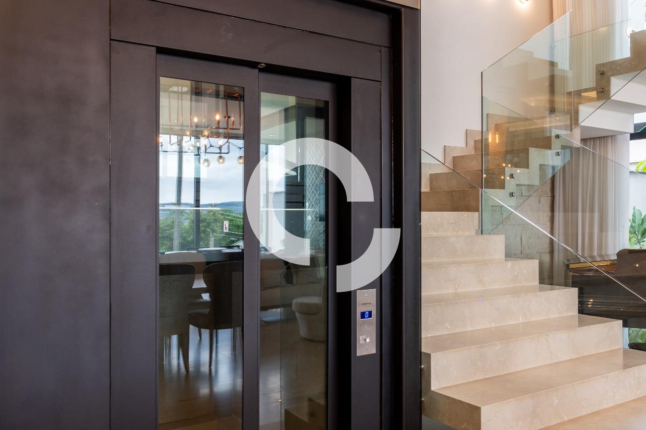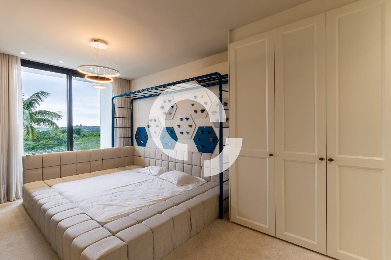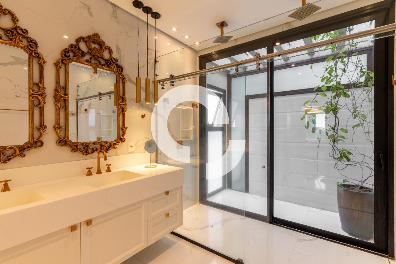 No pavimento superior, acessível tanto por escada quanto por elevador, estão cinco suítes amplas e confortáveis. A suíte master é um verdadeiro refúgio, com closet generoso e banheiro de design exclusivo, marcado por acabamentos refinados e decoração diferenciada.