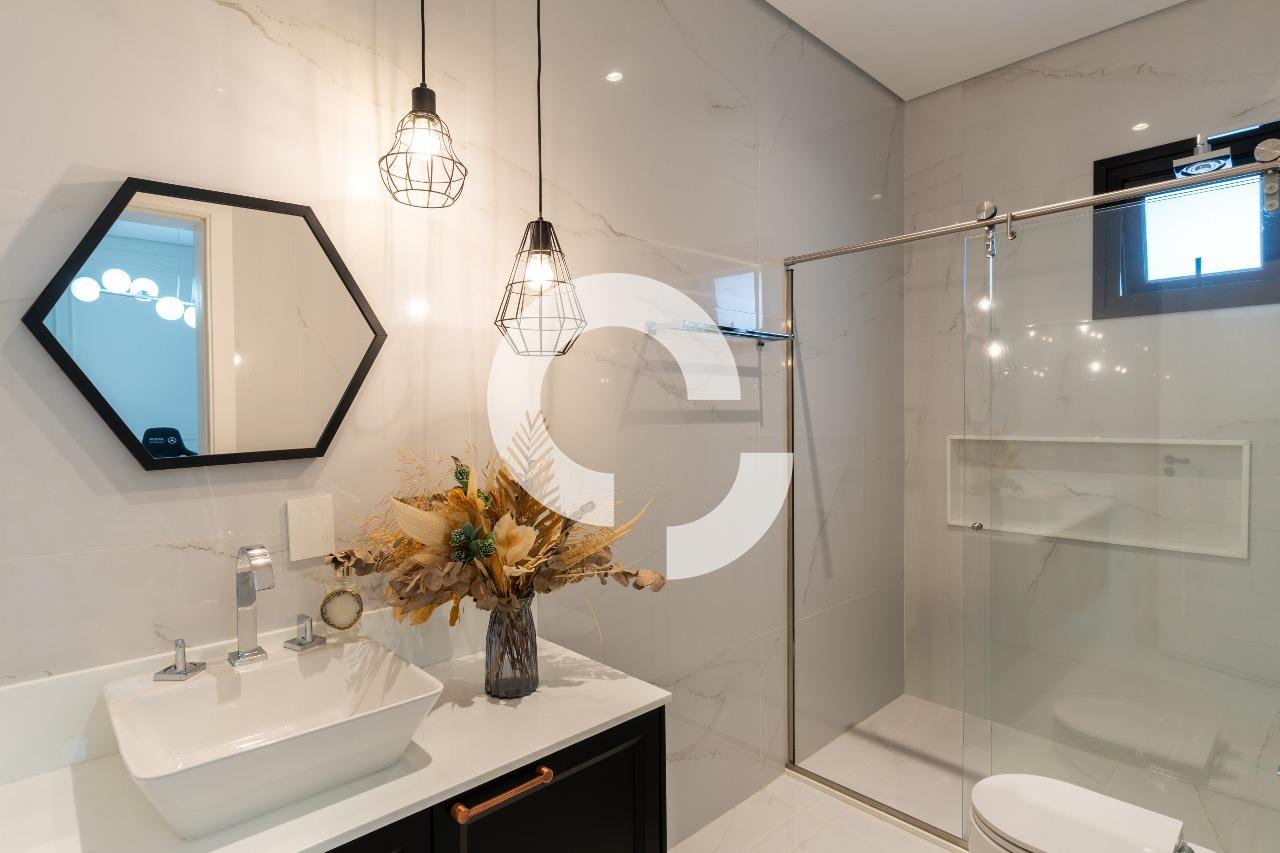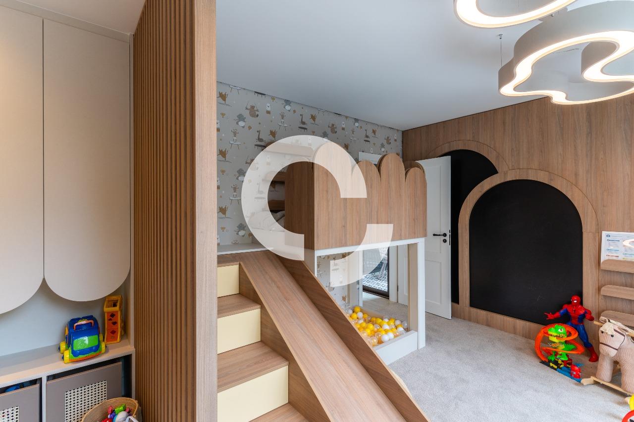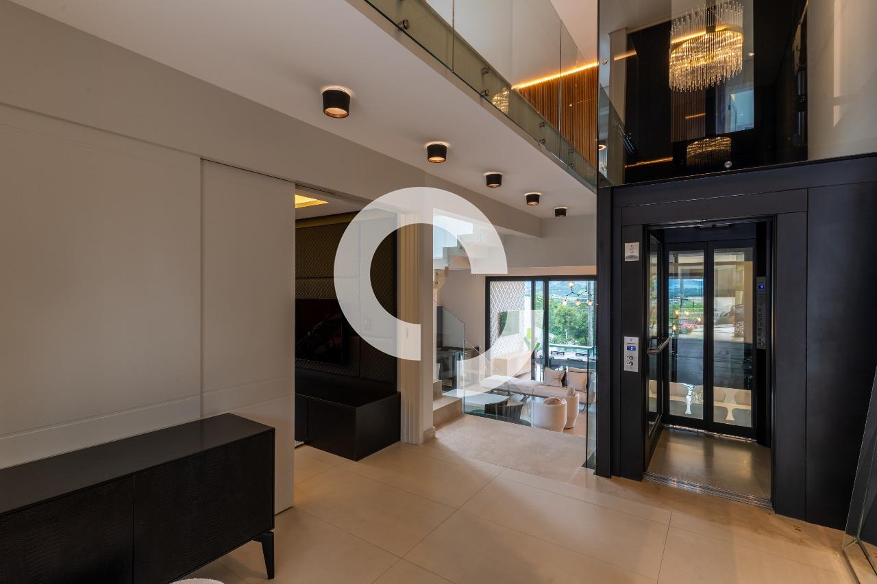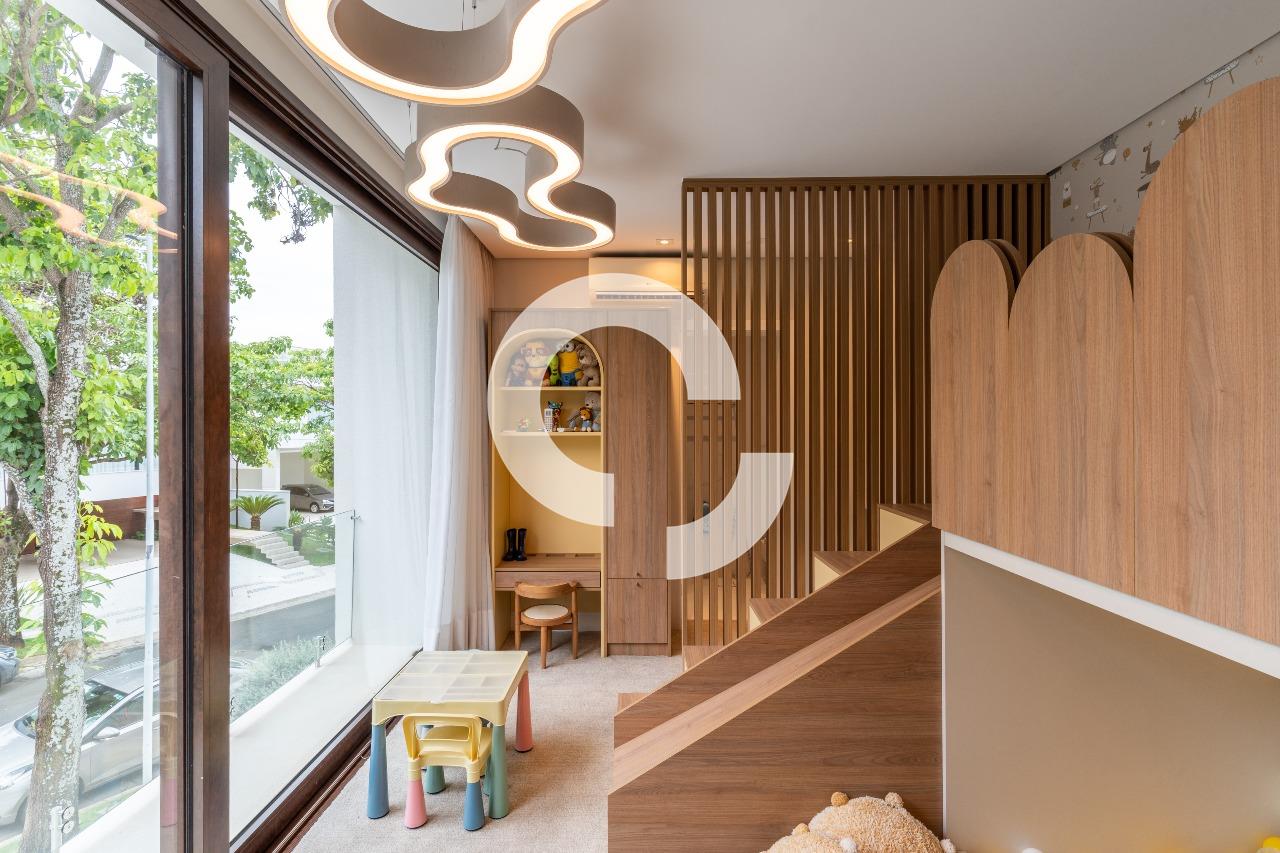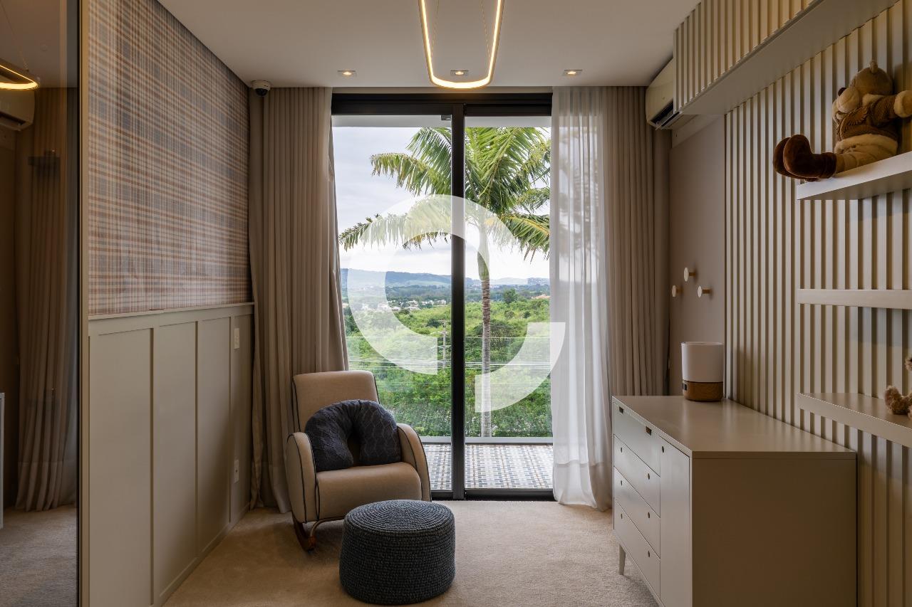 No pavimento superior, acessível tanto por escada quanto por elevador, estão cinco suítes amplas e confortáveis. A suíte master é um verdadeiro refúgio, com closet generoso e banheiro de design exclusivo, marcado por acabamentos refinados e decoração diferenciada.
