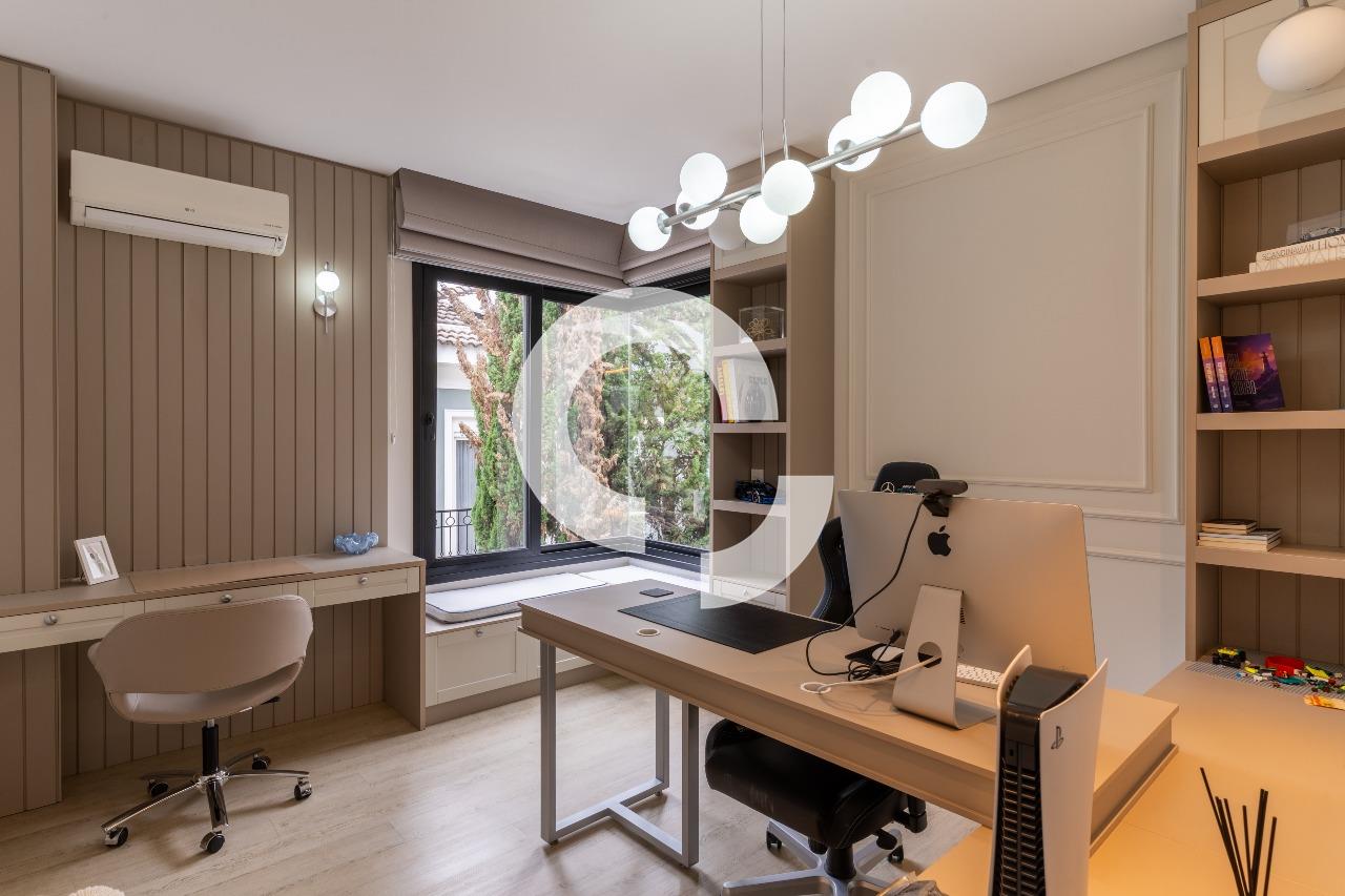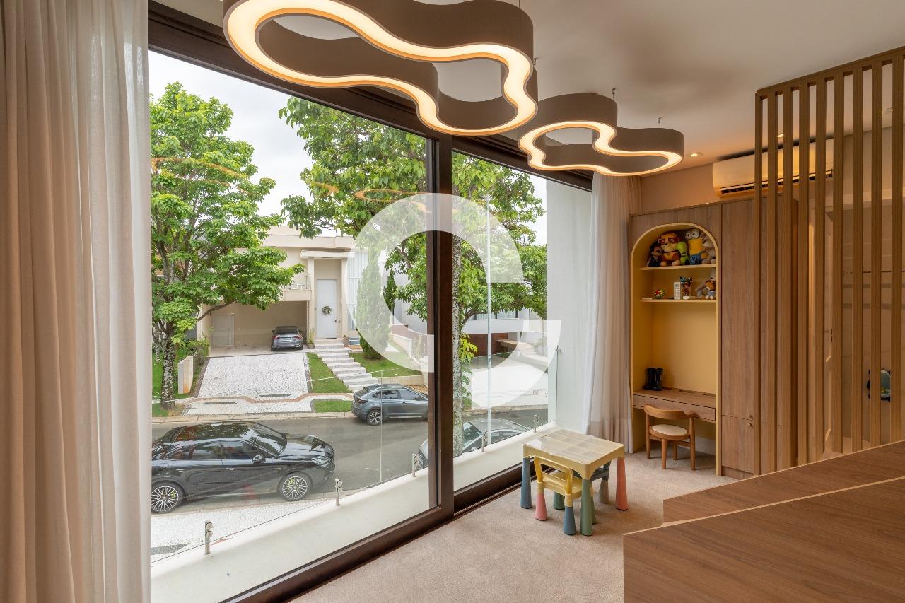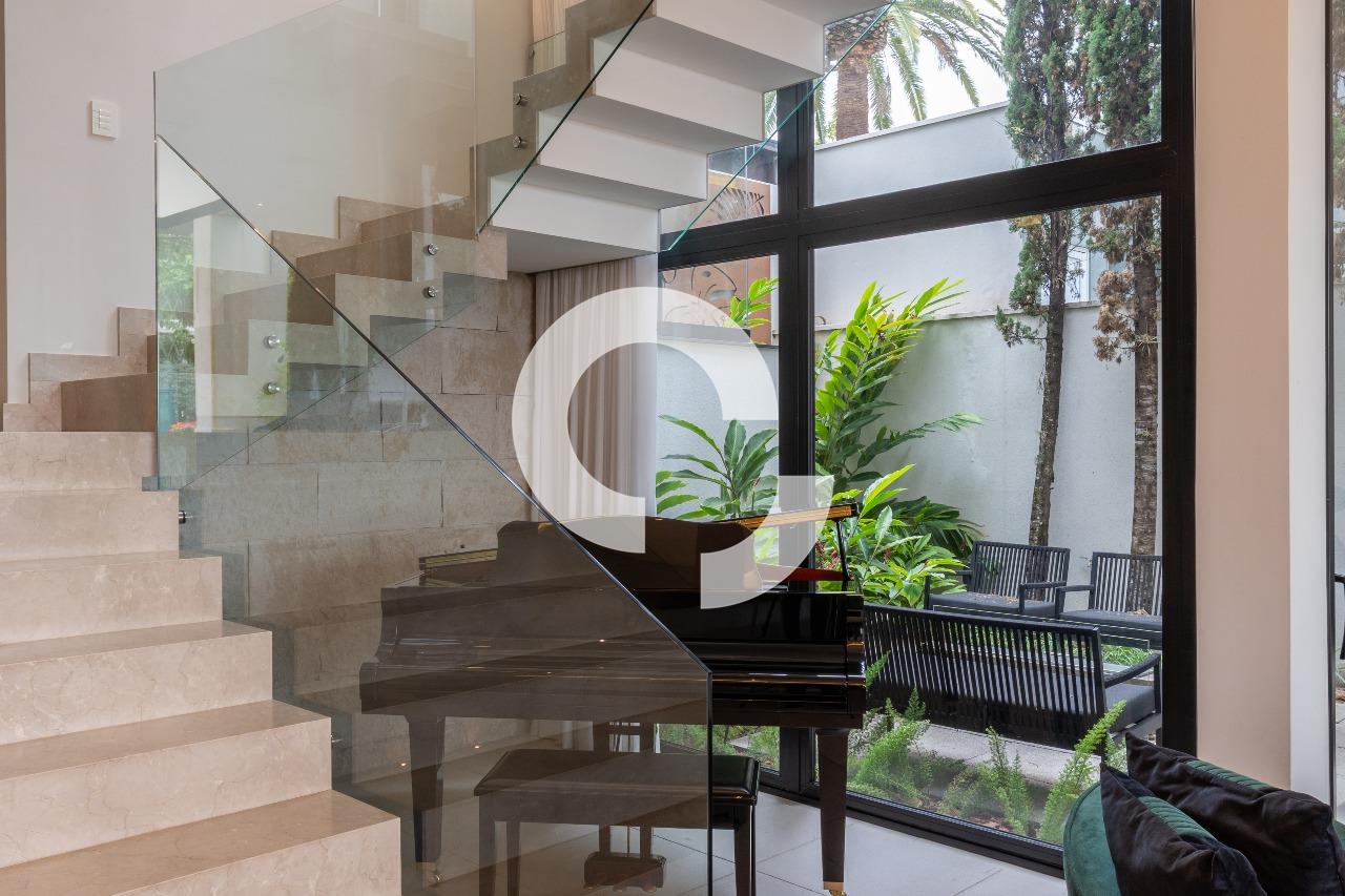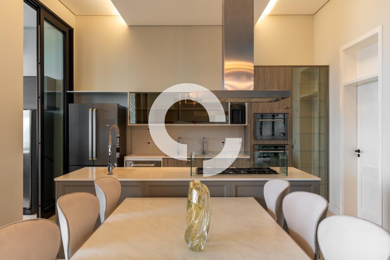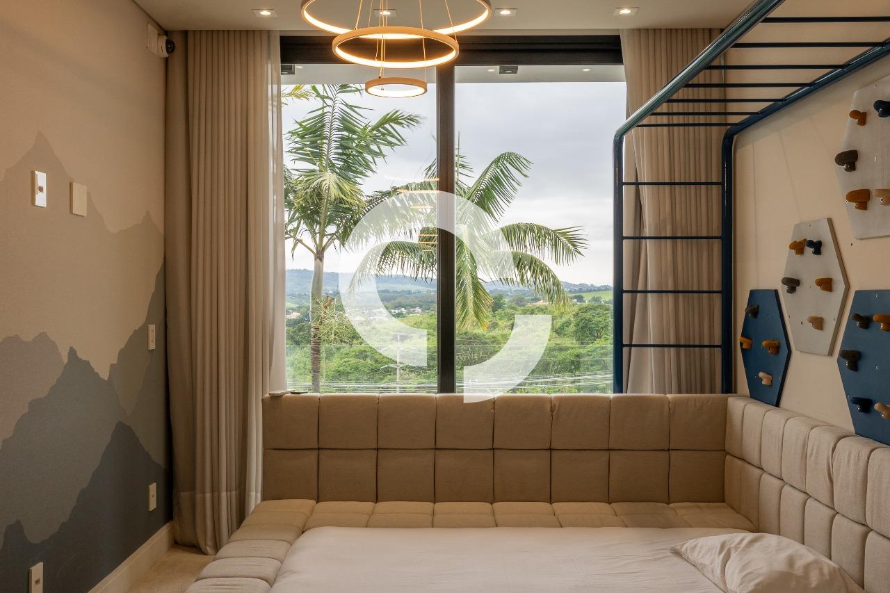 No pavimento superior, acessível tanto por escada quanto por elevador, estão cinco suítes amplas e confortáveis. A suíte master é um verdadeiro refúgio, com closet generoso e banheiro de design exclusivo, marcado por acabamentos refinados e decoração diferenciada.