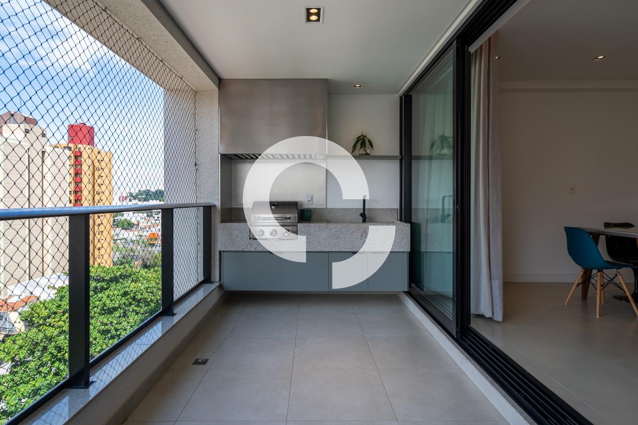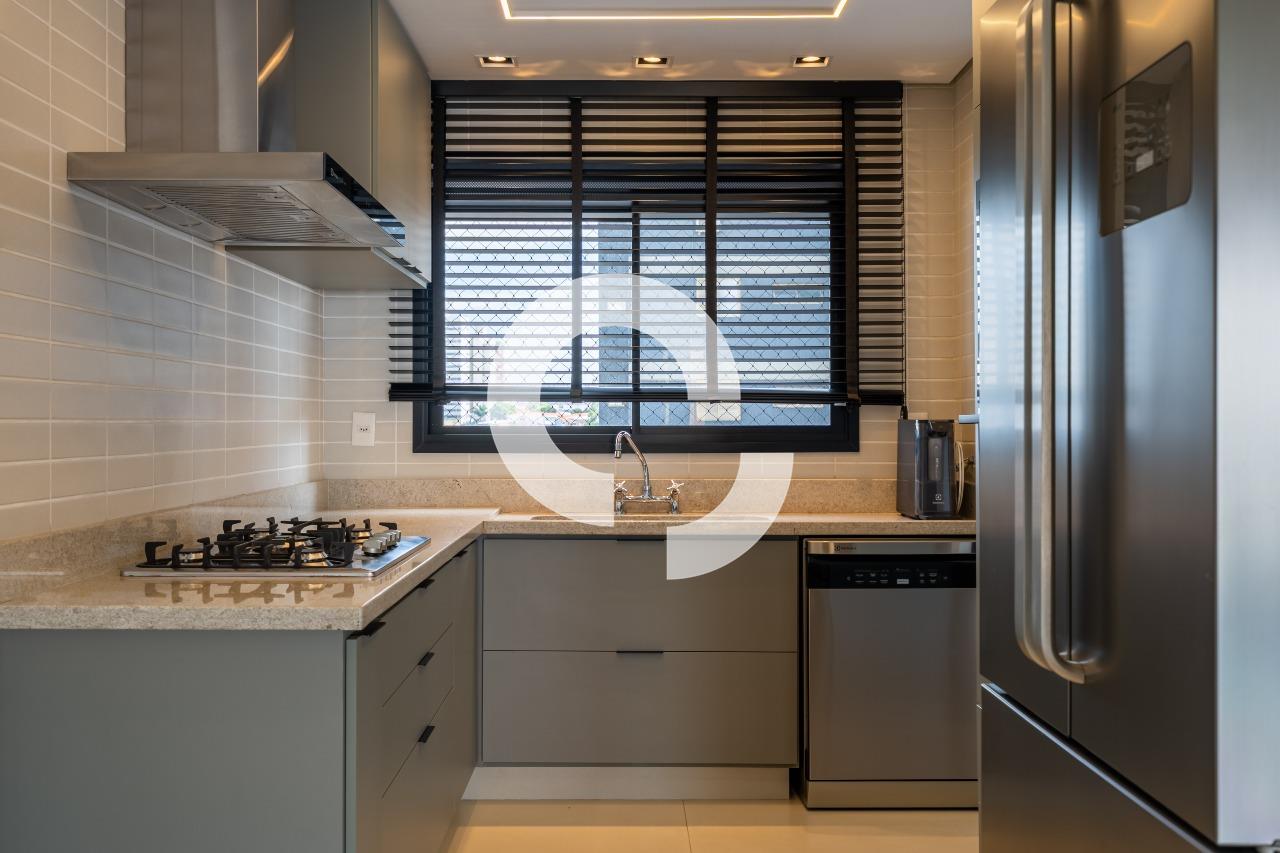 Sala integrada à cozinha planejada, varanda gourmet e três suítes com armários.