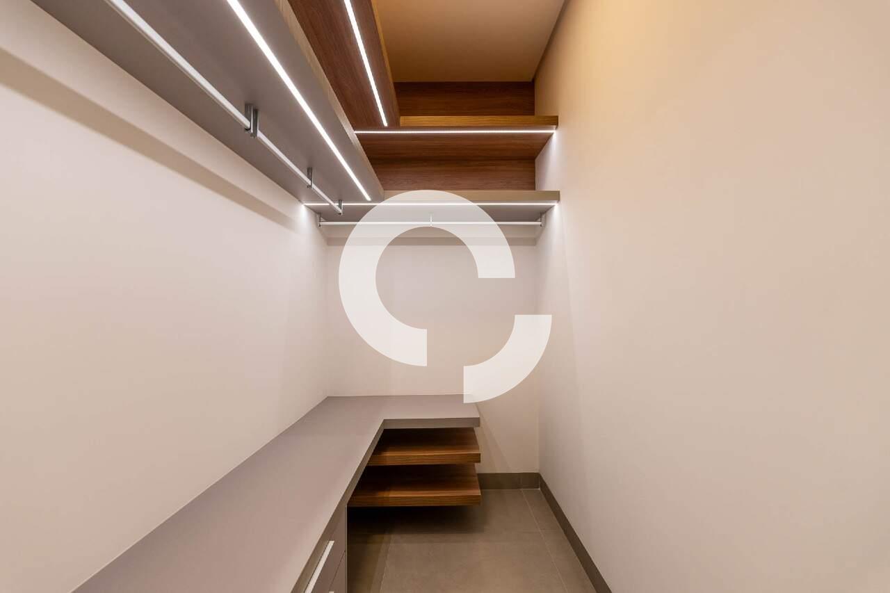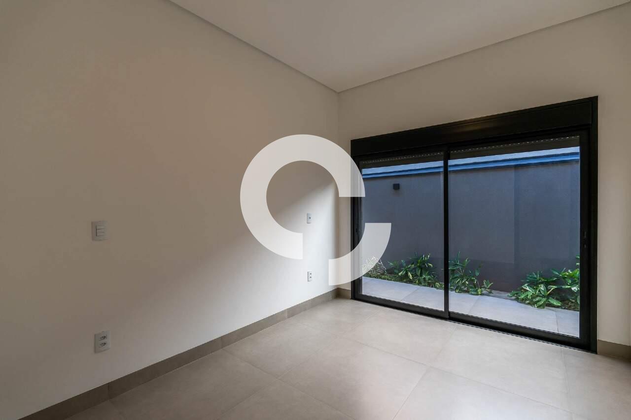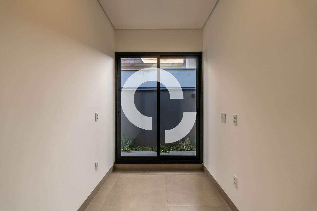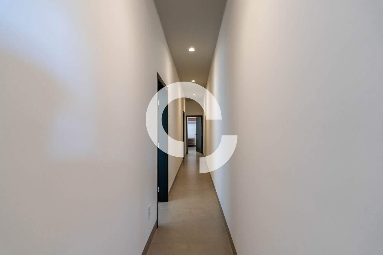 O corredor da área privativa conduz a um escritório isolado, proporcionando um espaço tranquilo para o home office. Seguindo adiante, você encontrará três suítes, todas com closet, que se abrem para o jardim lateral e para os fundos, onde uma vegetação rica completa o cenário.