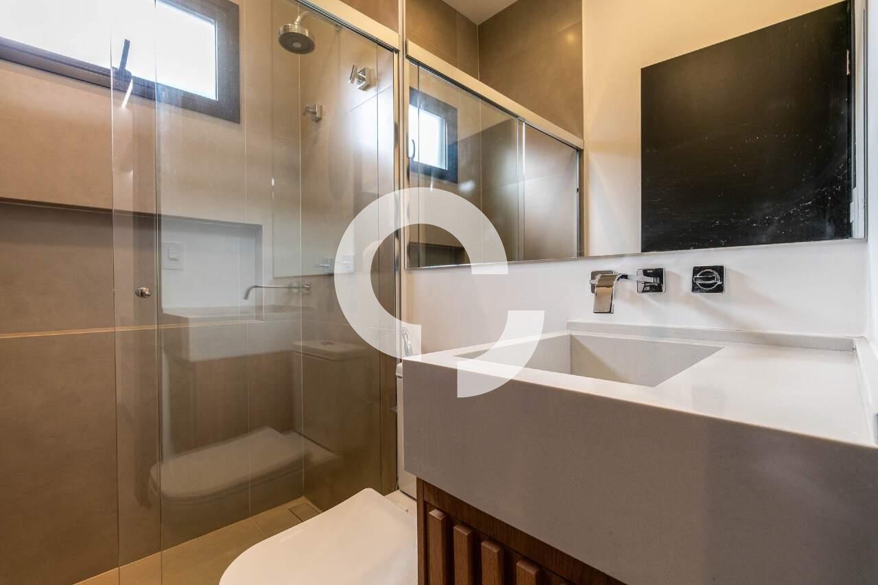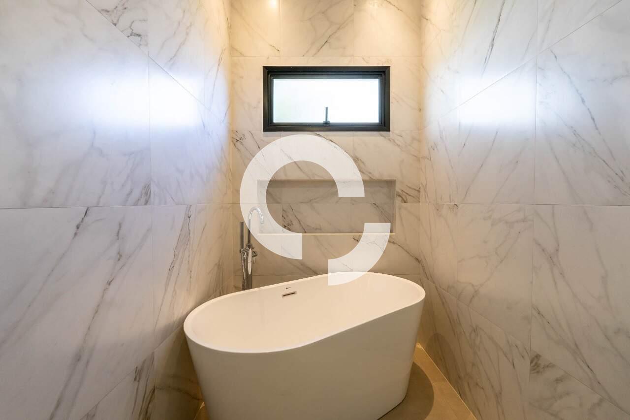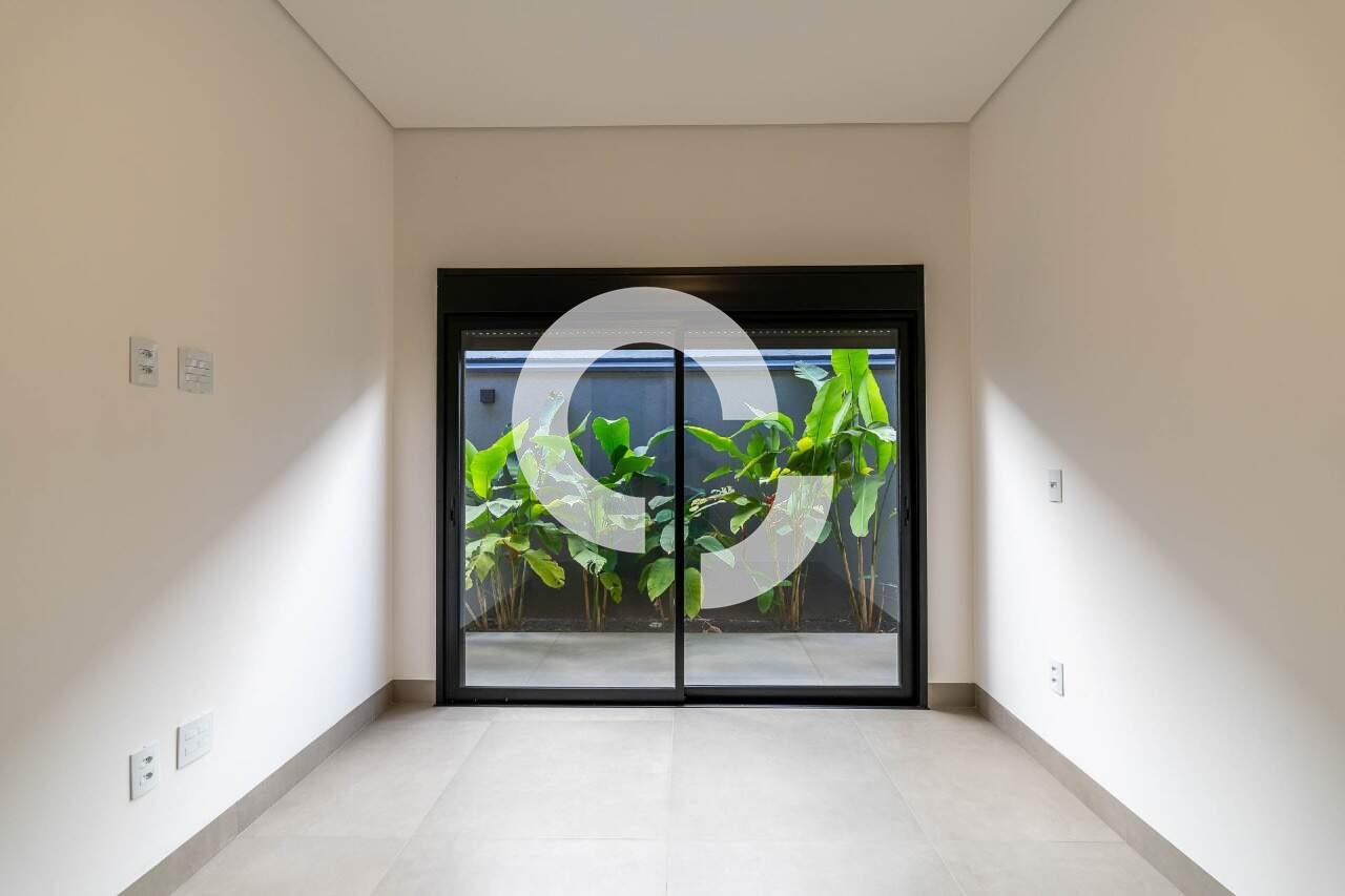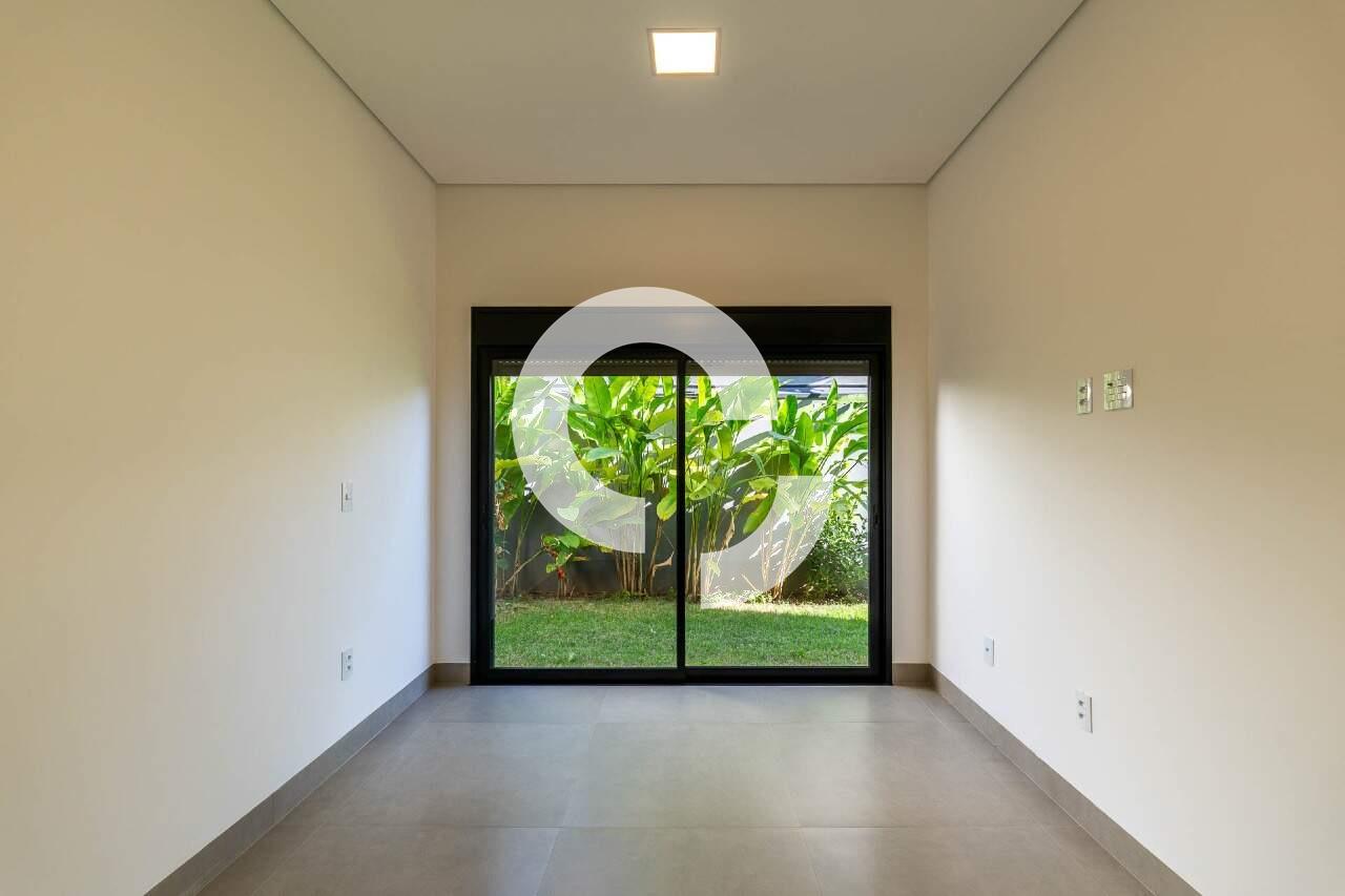 O corredor da área privativa conduz a um escritório isolado, proporcionando um espaço tranquilo para o home office. Seguindo adiante, você encontrará três suítes, todas com closet, que se abrem para o jardim lateral e para os fundos, onde uma vegetação rica completa o cenário.
