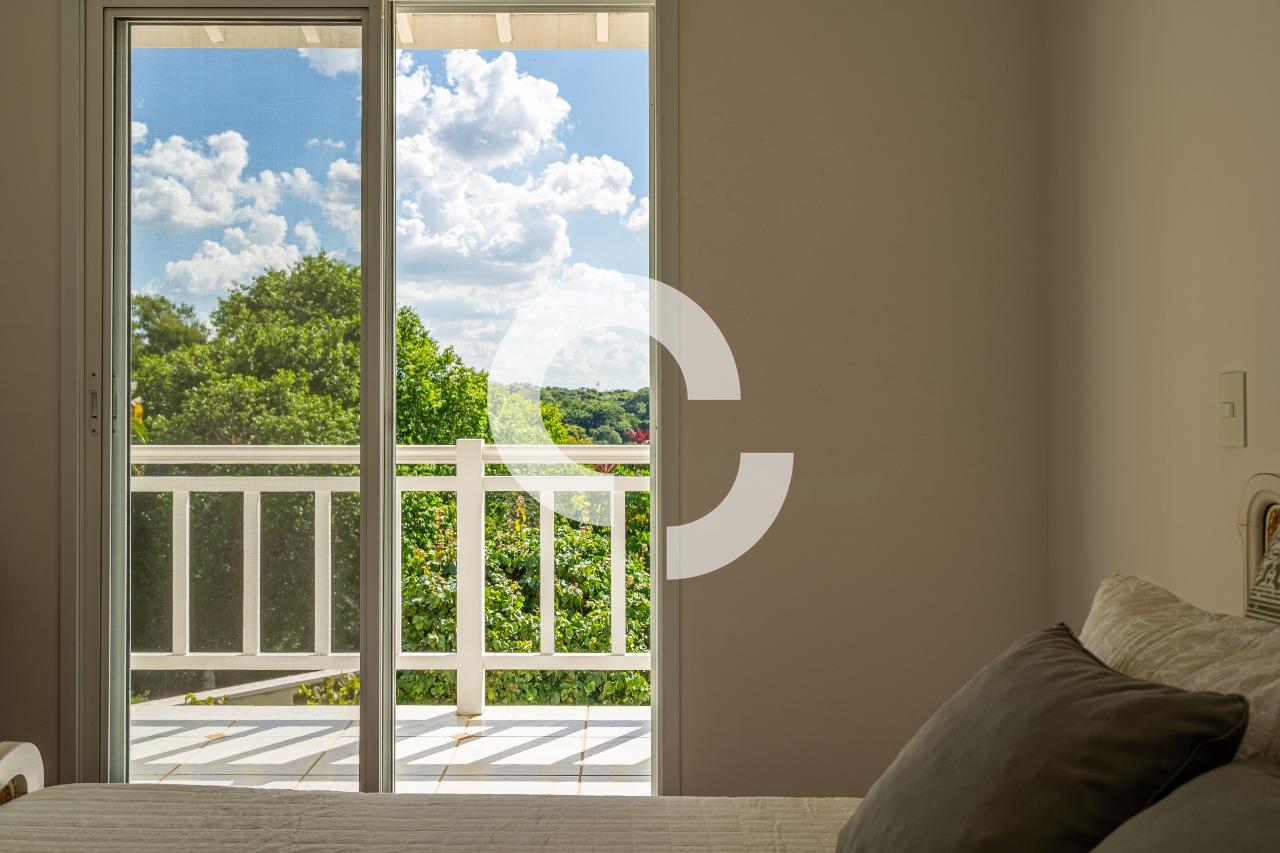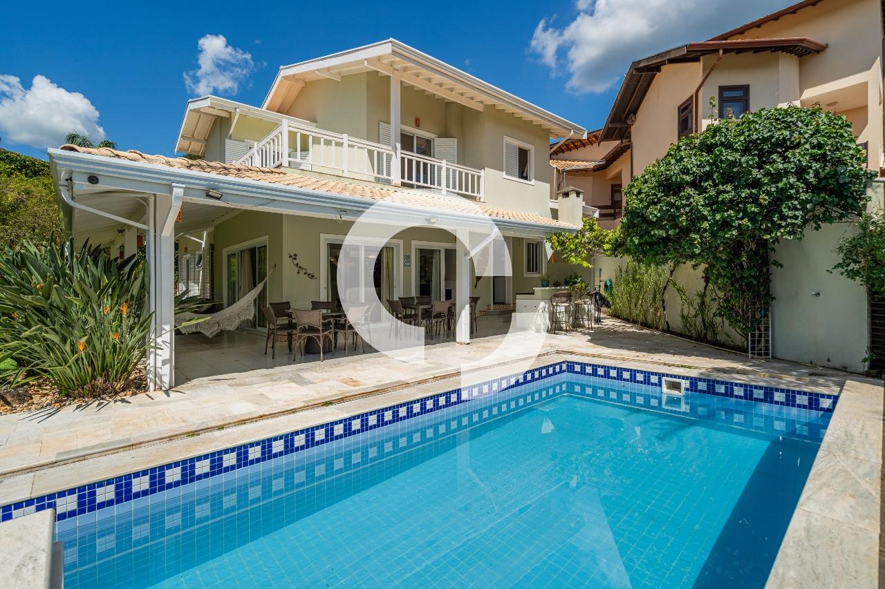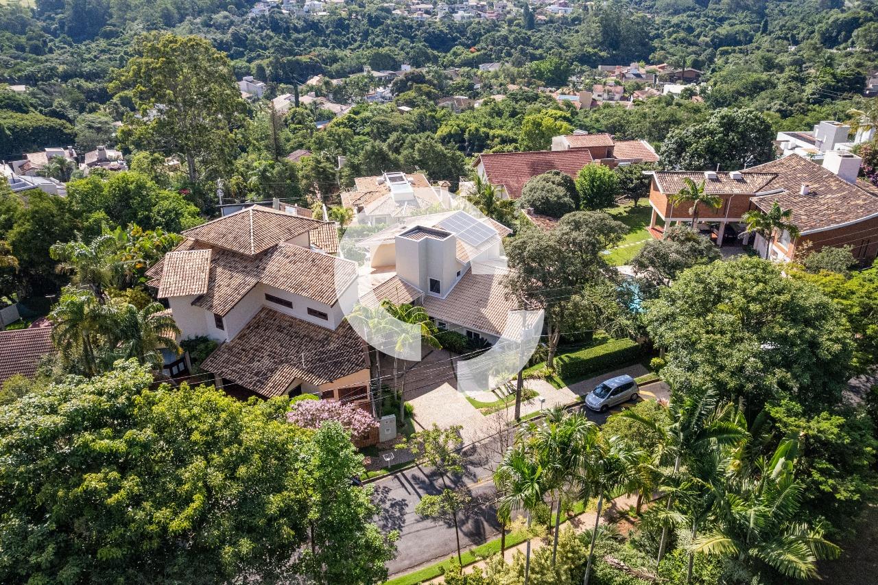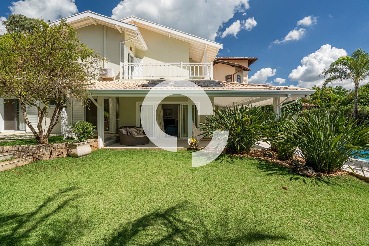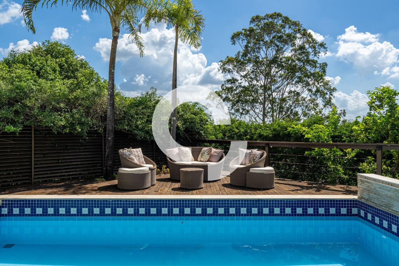 Em uma rua tranquila dentro do condomínio, esta belíssima residência está à venda e encanta pela perfeita integração e vista definitiva para área preservada.