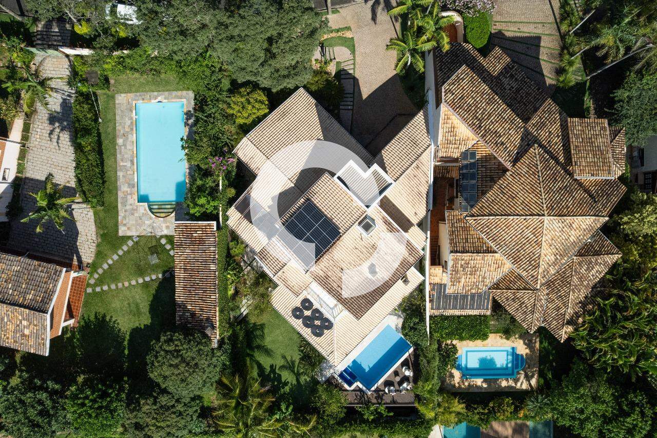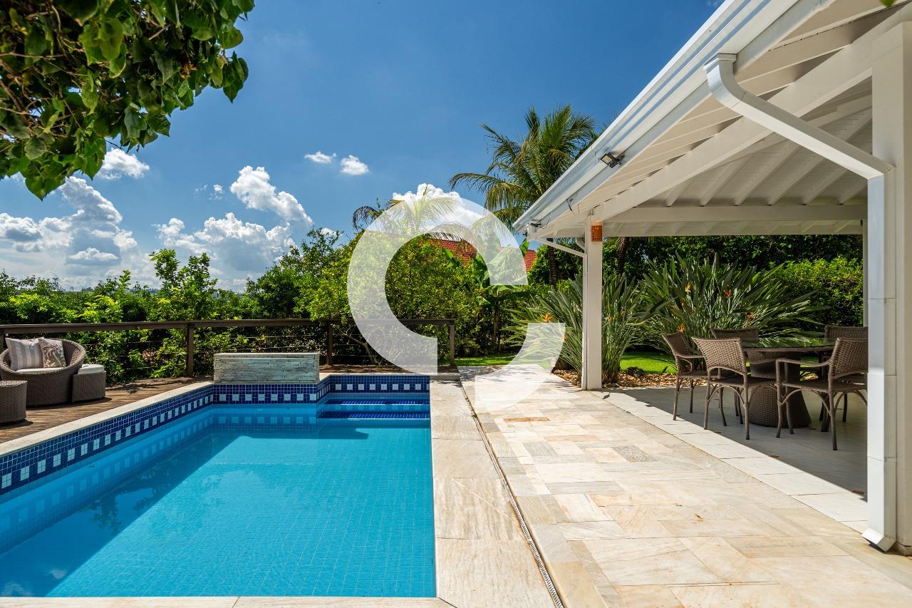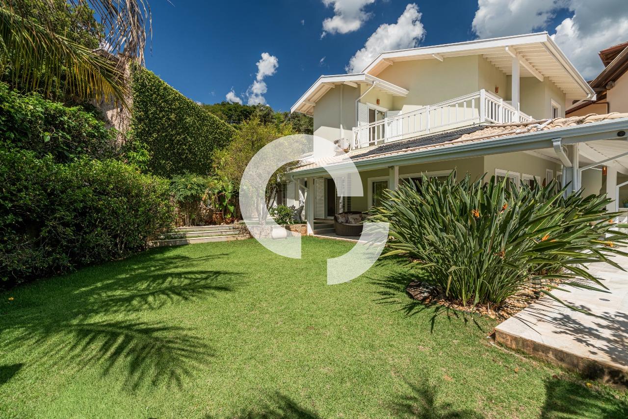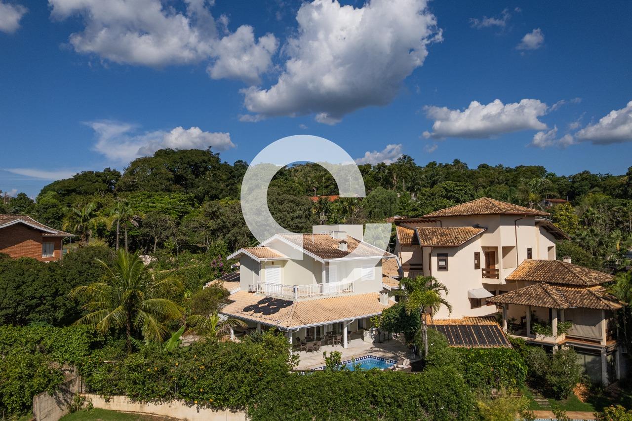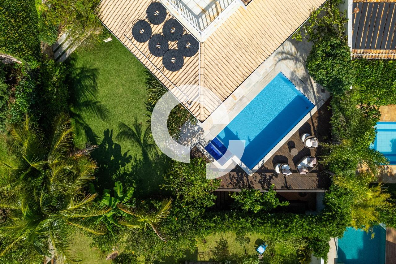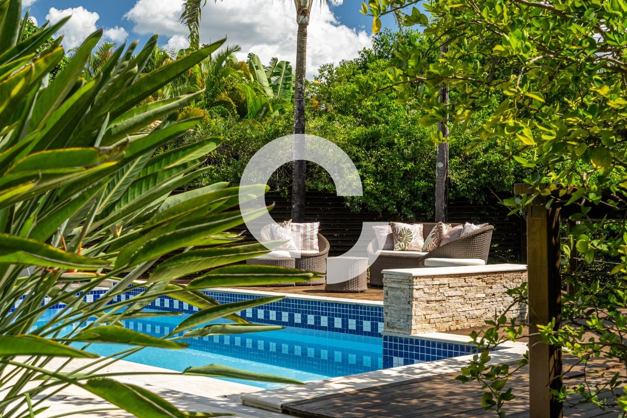 Em uma rua tranquila dentro do condomínio, esta belíssima residência está à venda e encanta pela perfeita integração e vista definitiva para área preservada.