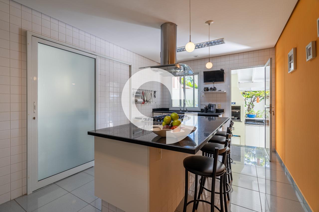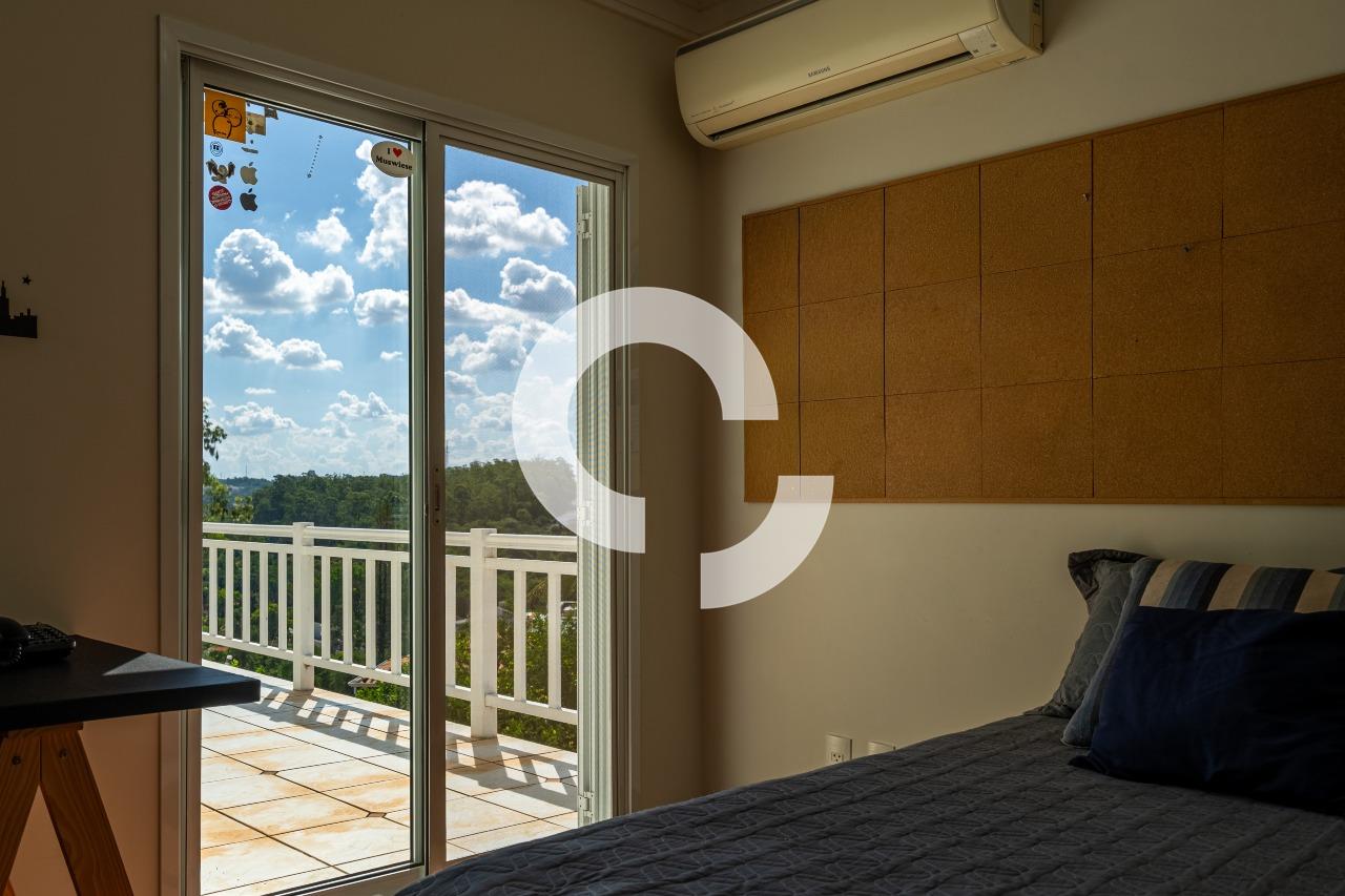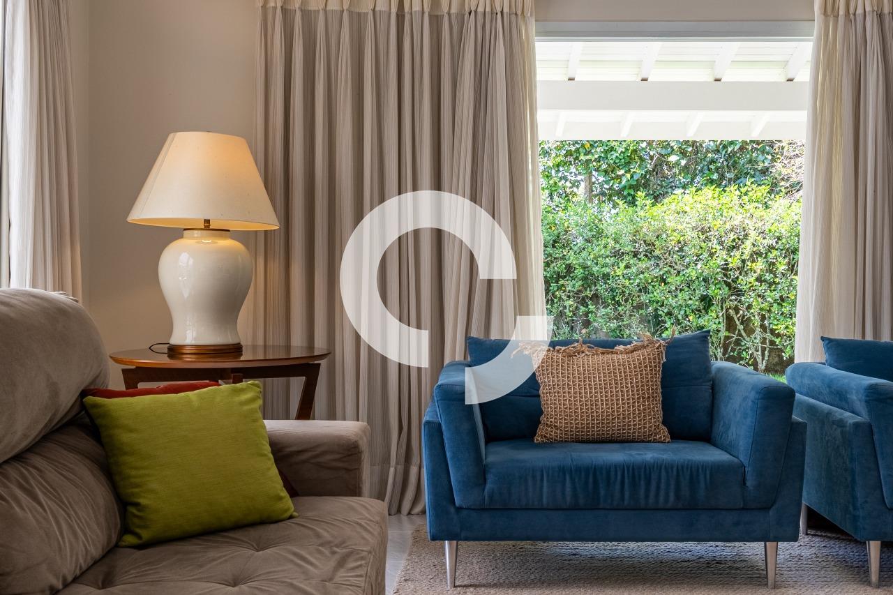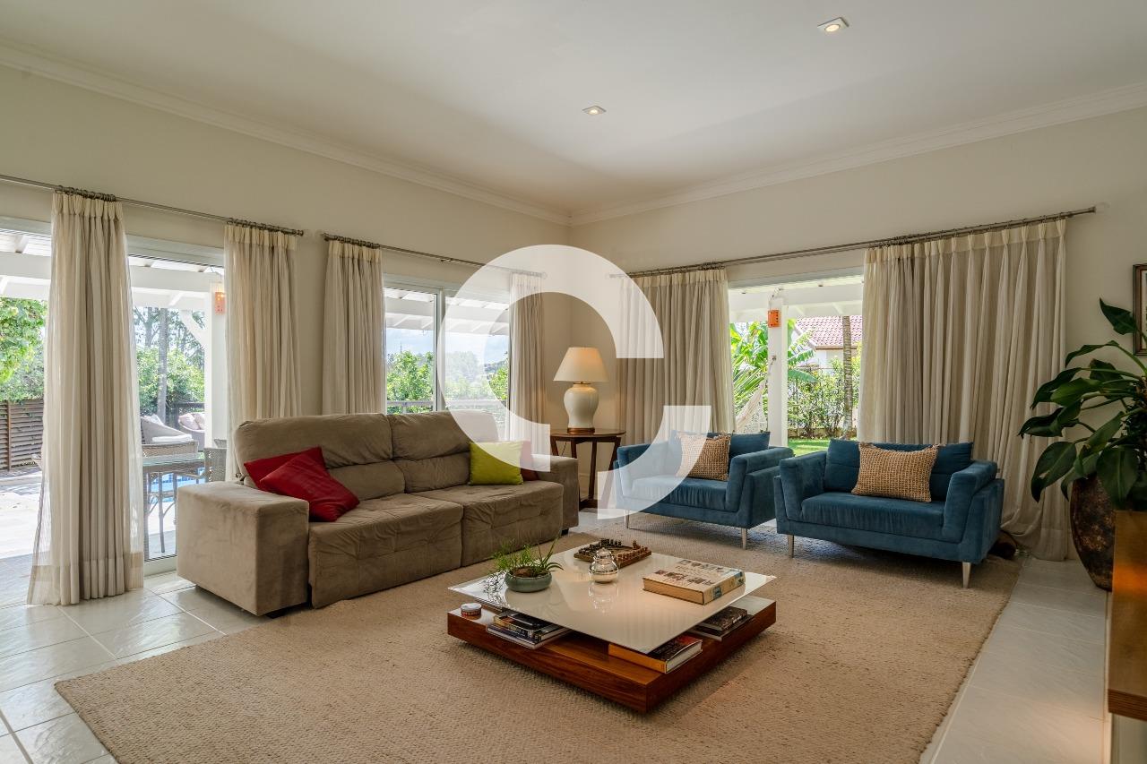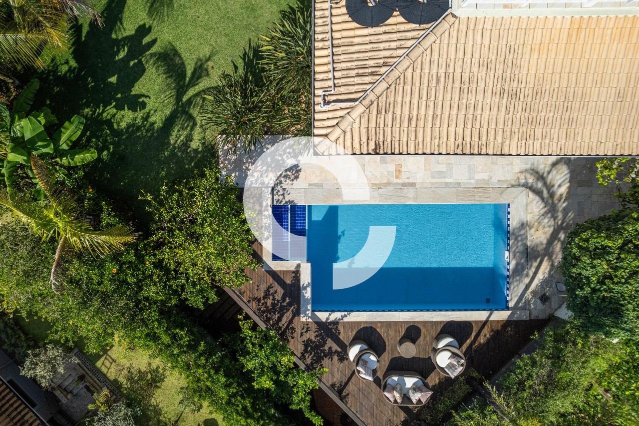 Em uma rua tranquila dentro do condomínio, esta belíssima residência está à venda e encanta pela perfeita integração e vista definitiva para área preservada.